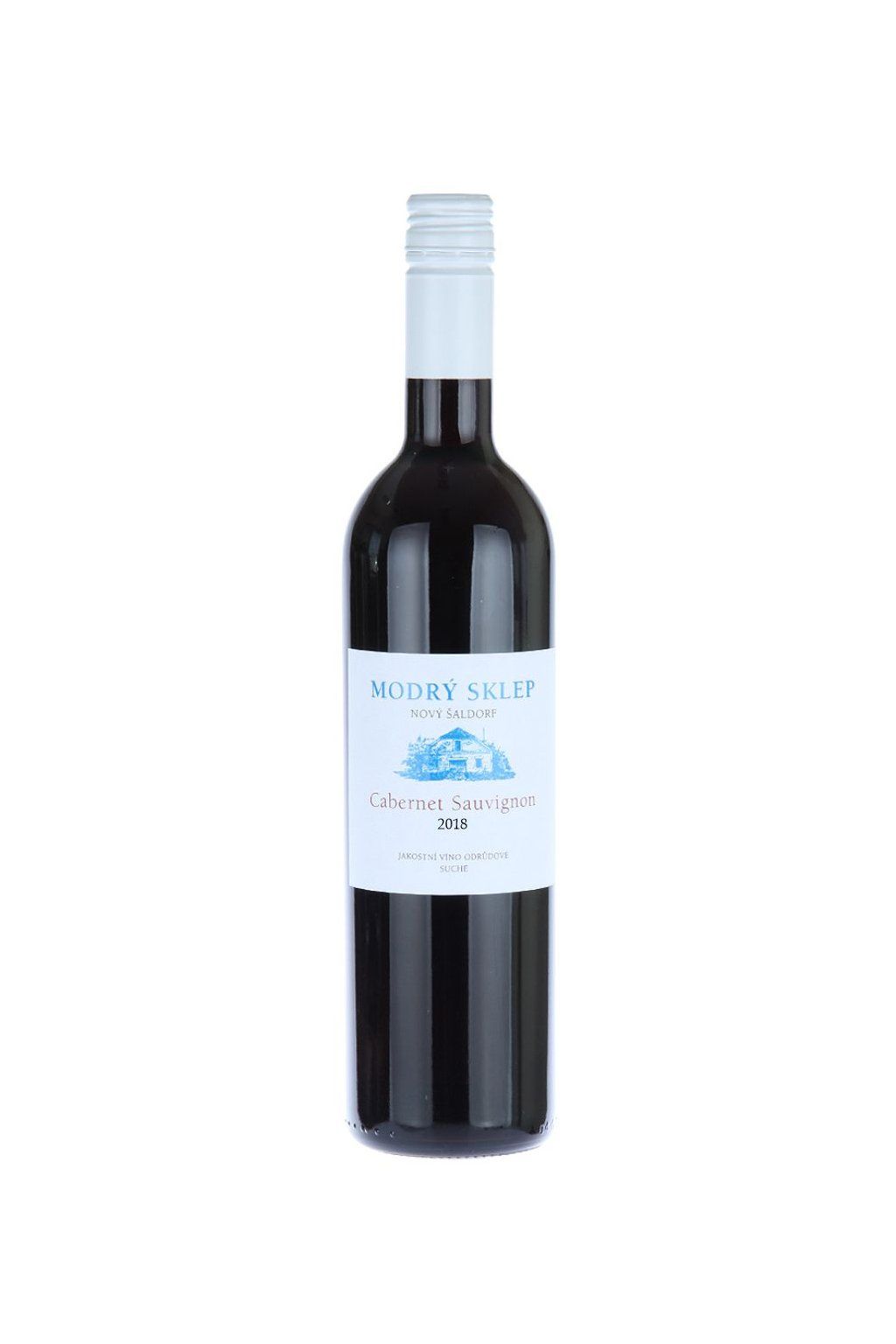 Suché jakostní červené víno odrůdy Cabernet Sauvignon, ročníku 2018, z Modrého sklepa v Novém Šaldorfě.